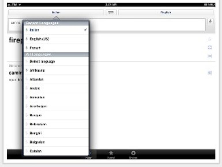 Im unteren Bereich befinden sich drei Tabs, um zwischen dem Übersetzer, Favoriten und Einstellungen hin- und herzuschalten. Über ein Mikrofon-Symbol kann direkt in das Mikro des Gerätes gesprochen werden. Über ein Aufklapp-Menü wird dabei zwischen verschiedenen Sprachen gewählt.