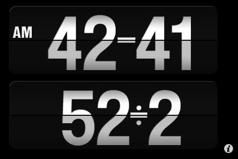 Die Math Clock ist zwar gut lesbar, stellt Anwender aber vor ein anderes Problem: Die Zeit wird als Mathematikaufgabe dargestellt. Um die Zeit zu erfahren, muss man immer zwei Aufgaben lösen, in den Systemeinstellungen kann zwischen drei Schwierigkeitsgraden gewechselt werden. Um das Ergebnis zu überprüfen, muss einfach nur auf die entsprechende Rechenaufgabe getippt werden.