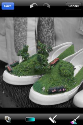 Einfacher soll es vor allem werden, denn beim ersten Antippen nimmt ColorBlast die Farbe unter dem Finger auf und es werden nur ähnliche Farbtöne gemalt. Natürlich hat auch diese Farbtoleranz ihre Grenzen: Beim Schuh in diesem Beispiel lagen einige Grüntöne außerhalb dieses Toleranzbereichs und mussten dann getrennt selektiert werden. Dann ist es allerdings schwerer, mit dem Finger, der ja kein Präzisionswerkzeug ist, den gewünschten Bereich zu treffen. Hier hilft dann nur die Lupe.