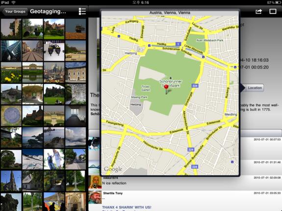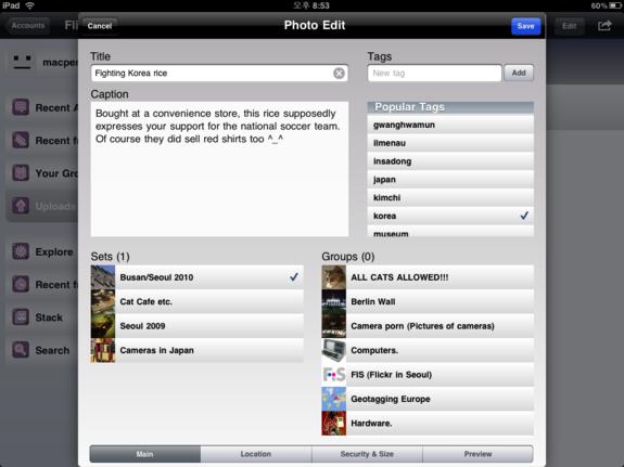 Besonders einfach ist die Bedienung nicht: Die „Alles auswählen”-Option erscheint unter der Verschicken-Schaltfläche, ebenso wie der Offline-Modus. So wird dem Einsteiger auch entgehen, dass sich gleich mehrere Fotos gleichzeitig bearbeiten lassen: Gruppen, Tags, maximale Bildgröße, Sichtbarkeit, Fotosets und Titel lassen sich eingeben. Merkwürdig ist die Festlegung des Ortes: Weder wurde der aktuelle Ort richtig bestimmt, noch ließ sich der Pin verschieben oder nach einem Ort suchen.