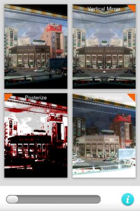 Nach dem Start blickt man nicht auf ein Bild, sondern gleich vier davon. Durch Antippen eines Bildes wird das Foto geschossen. Zu einer spürbaren Verzögerung führt die Live-Anzeige der Effekte nicht. Wer ein paar Fotoeffekt-Apps und ihre Berechnungszeiten kennt, wird sich vielleicht wundern, aber die Effekte von Lenses sind nicht gerade die aufwändigsten. Neben Farbeffekten (Sepia, Farbwerte vertauschen), gibt es die Kategorien Zerrspiegel, Kunst (Warhol, Neon), Rahmen (Mona Lisa, Che) und Verschiedenes (Tilt Shift, Wärmebild). Lenses bietet einen Digitalzoom und kann die bearbeiteten Bilder in voller Auflösung sichern.