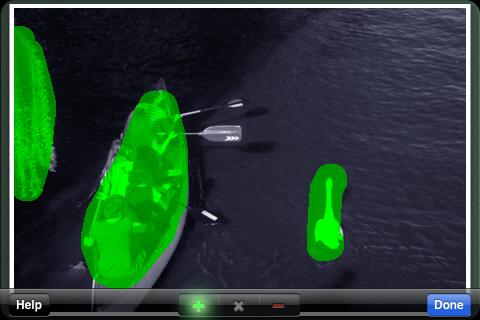 Bei diesem Foto sind der Schwan und das Boot relevante Bildteile. Folglich spart Liquid Scale vor allem an der Wasserfläche zwischen dem Schwan und dem Boot. Der Schwan rückt also bei einer Verkleinerung des Bildes näher an das Boot heran. Natürlich hat auch der beste Algorithmus seine Grenzen und das Bild eignet sich besonders gut für die iPhone-App. Deshalb lassen sich wichtige (grün) und unerwünschte Bereiche (rot) grob markieren.