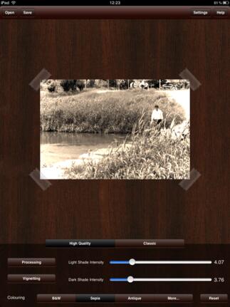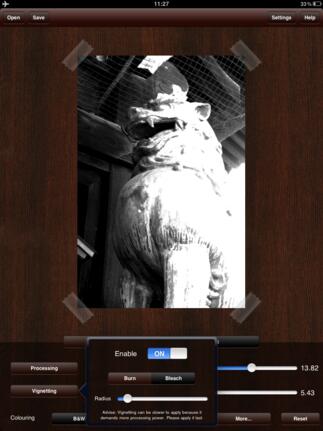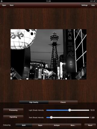 MonoPhix HD konvertiert jedes Farbbild in eine S/W- oder Sepia-Aufnahme, ist also sehr spezialisiert. Zunächst wird ein Foto ausgewählt, das dann sofort bearbeitet wird. Das Vorschaubild ist relativ klein, in den Einstellungen kann die Größe erhöht werden, dann folgt allerdings eine kurze Berechnungszeit auf jede Parameteränderung.