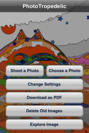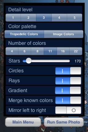 PhotoTropedelic verwandelt jedes Foto in ein psychedelisches Bild, dass aus den 60er oder 70er Jahren stammen könnte. Klare Farben, bunte Blasen, Sternchen und Strahlen sorgen für einen verspielten Eindruck. In den Optionen lässt sich einstellen, wie detailliert das Ergebnis sein soll. Bis zu 22 Farben verwendet die App, entweder aus dem Foto oder der eigenen Farbpalette. Jeder der Zusatzeffekte (Kreise, Strahlen, Verlauf, zusammenfassen bekannter Farben) lässt sich ein- und ausschalten, die Anzahl der Sterne kann ebenfalls verändert werden.
