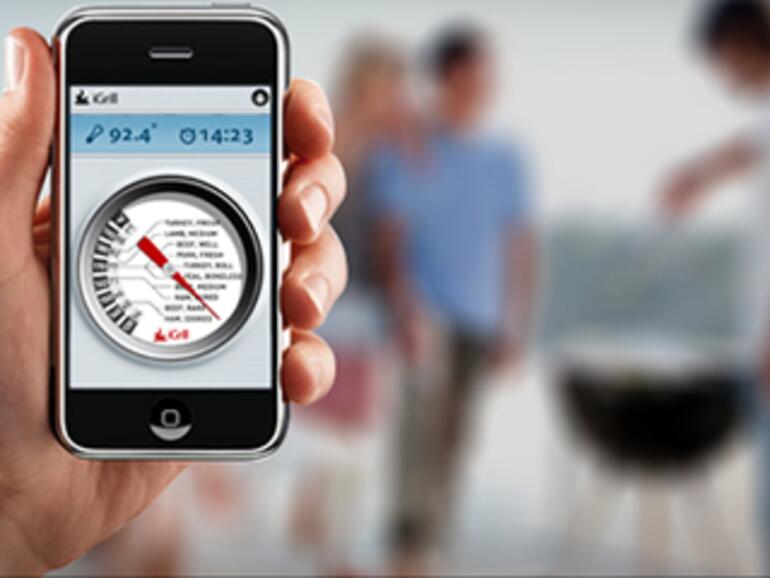 Bis zu 204 Grad Celsius misst das iGrill-Thermometer im Ofen über den in das Fleisch einzuführenden Metallstab und gibt die Messwerte in Echtzeit an iPhone oder iPad weiter, wo sie mit den zuvor eingestellten Parametern Wunschtemperatur und Gargut abgeglichen werden, um zur rechten Zeit Alarm schlagen zu können.