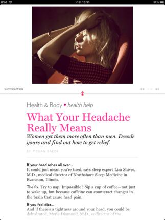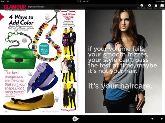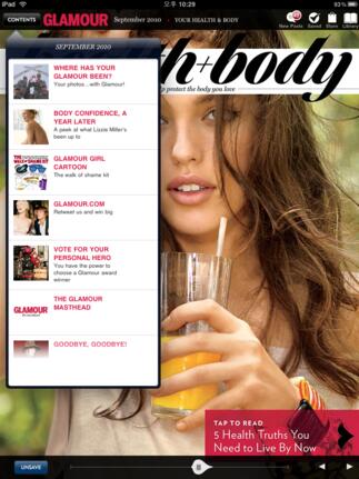 Was Glamour zum vielleicht ungewöhnlichsten iPad-Magazin macht, ist die Unterscheidung zwischen Querformat und Portraitmodus. Die WIRED-App hält einfach jede Seite in zwei Versionen bereit, zeigt aber doch die gleichen Inhalte. Bei der Glamour ändern sich hingegen Darstellung und Bedienung radikal. Im Querformat werden zwei Seiten nebeneinander abgebildet, der Inhalt entspricht genau dem Heft, inklusive aller Anzeigen. Das Inhaltsverzeichnis kann nicht jederzeit eingeblendet werden und als multimediale Erweiterung gibt es lediglich Filme in einigen Werbeanzeigen.