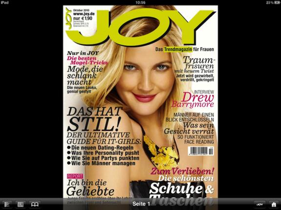 Die App startet mit einer Anzeige im Vollbild, erst danach kann das Heft ausgewählt werden. Es wird das komplette Heft dargestellt, wahlweise im Quer- (zwei Seiten) oder Portraitformat (eine Seite). Bevor aber überhaupt die erste Seite dargestellt wird, läuft ein pixeliges Filmchen ab, welches Drew Barrymore auf dem roten Teppich zeigt. Nichts gegen Drew Barrymore, aber muss wirklich bei jedem Start immer wieder das Zwanzig-Sekunden-Filmchen gezeigt werden, in dem sie ihr (langweiliges) Kleid zeigt?