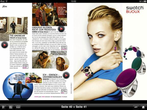 Wie bereits erwähnt, sind es vor allem die multimedialen Inhalte, welche für die lange Downloadzeit verantwortlich sind. Das schürt natürlich die Erwartungen, welche zumindest die Erstausgabe allerdings nicht erfüllt: Videos gibt es hauptsächlich bei den Kinoseiten und den Anzeigen. Trailer fest in ein Magazin einzubinden, ergibt allerdings keinen Sinn, sinnvoller wären Videos beispielsweise bei dem Farbspielerei-Artikel oder Mode-Artikeln. Der Rest der interaktiven Inhalte sind Verweise ins Web, eine Shopping-Liste wie die Glamour-App bietet die JOY nicht.