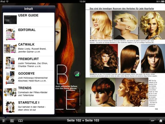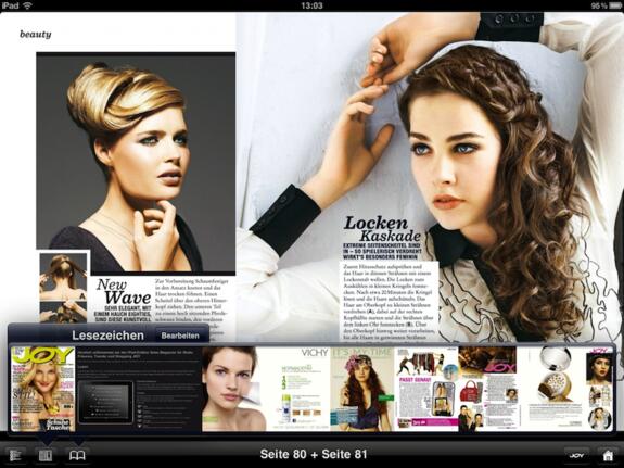 Wirklich störend ist aber der Umblätter-Effekt: Während bei anderen Magazinen die nächste Seite einfach in das Bild geschoben wird, zeigt die JOY eine Art Mosaik-Effekt, bei dem die Seite aus mehreren großen Blöcken aufgebaut wird. Solche Effekte sind aber viel zu aufdringlich, gerade wenn sie wie bei dieser App ständig verwendet werden. Das Magazin ist übrigens kein PDF, sondern setzt sich sich aus über 1000 dieser Blöcke im PNG- und JPEG-Format zusammen - viel umständlicher geht es nicht mehr.