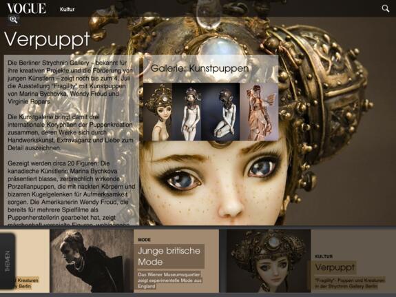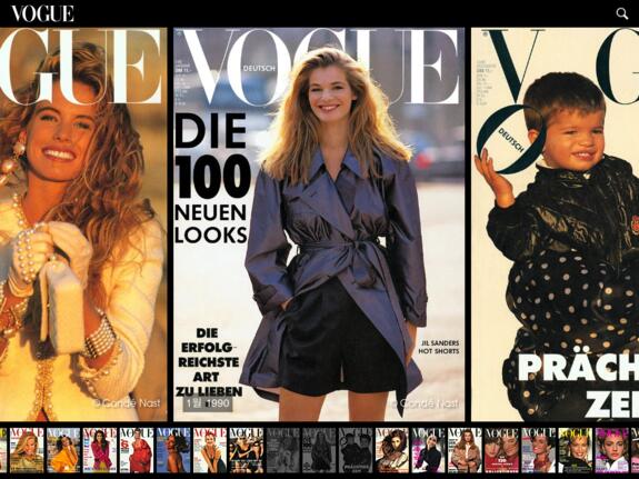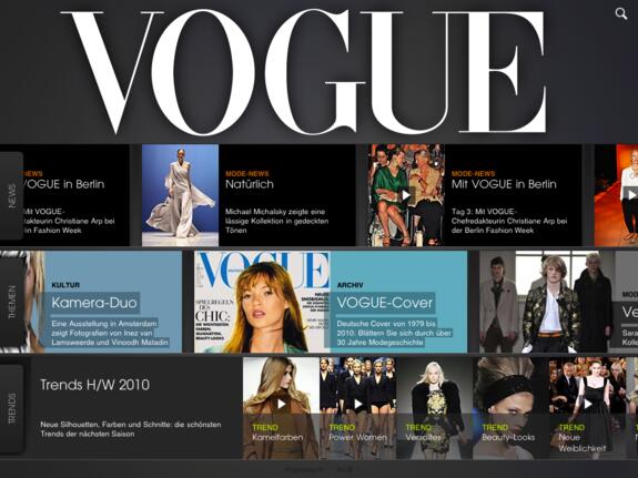 Die Printausgabe präsentiert auf Hochglanzpapier die aktuellen Modetrends und natürlich ist auch auf dem spiegelnden iPad alles enthalten, was die Vogue ausmacht: Berichte von den Modeschauen, aktuelle Trends und Interviews. Der Verlag weiß um die Qualität der Fotos und stellt sie deshalb im Vollbild dar, Textkästen werden halbtransparent darüber gelegt, lassen sich aber auch ganz aus dem Bild schieben.