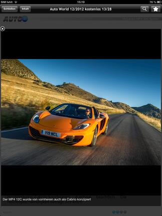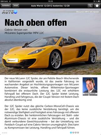 Alle Inhalte des Magazins sind in HD Auflösung integriert und somit perfekt an das Retina Display angepasst. Jede Menge Fotos und Videos sind interaktiv direkt in den Tests enthalten und können so jederzeit auch ohne aktive Internetverbindung angesehen werden. Die aktuelle Ausgabe 12-2012 enthält atemberaubende Bilder und multimediales Material des neuen Cabrio-Supersportlers McLaren MP4 12C Spider.