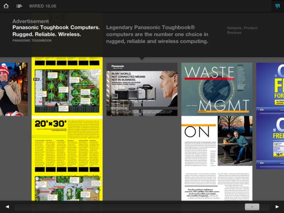 Flash hätte sich angeboten, da die WIRED mit InDesign erstellt wird und CS5 auch native iPhone-Apps ausgeben kann. Wie die jetzt im App Store zu findende App sich gegenüber der mit Flash erstellen behaupten würde, kann nicht beurteilt werden. Auffällig ist zunächst die mit über 500 MB enorme Größe des Magazins, eine Online-Verbindung setzt die App nicht vorraus.
