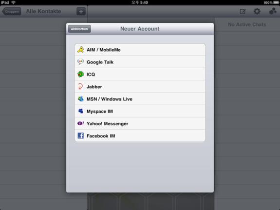 Wie die iPhone- spricht auch die iPad-Version mehrere Chat-Protokolle: AIM/MobileMe, Google Talk, ICQ, Jabber, MSN, MySpace IM, Yahoo! Messenger und Facebook IM. Da Facebook derzeit keine eigene iPad-App anbietet, ist die Unterstützung für die Chat-Funktion des Social Networks sehr willkommen.