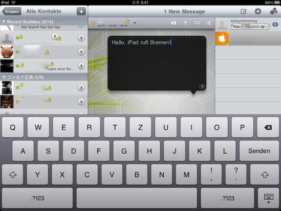 Die Bildschirmdarstellung ist in drei Bereiche aufgeteilt: Links die Gruppen und Kontakte mit ihrem Online-Status, rechts die Liste der Gesprächspartner und in der Mitte der Chat-Bereich. Hintergrundbilder sind optional und die mitgelieferten erscheinen größtenteils wenig geeignet für den Hintergrund. Im Portrait-Modus ändert sich die Darstellung, die Kontakte-Liste erscheint dann als Pop-Up-Fenster. Der Emoticon-Picker hat es noch nicht auf das iPad geschafft.