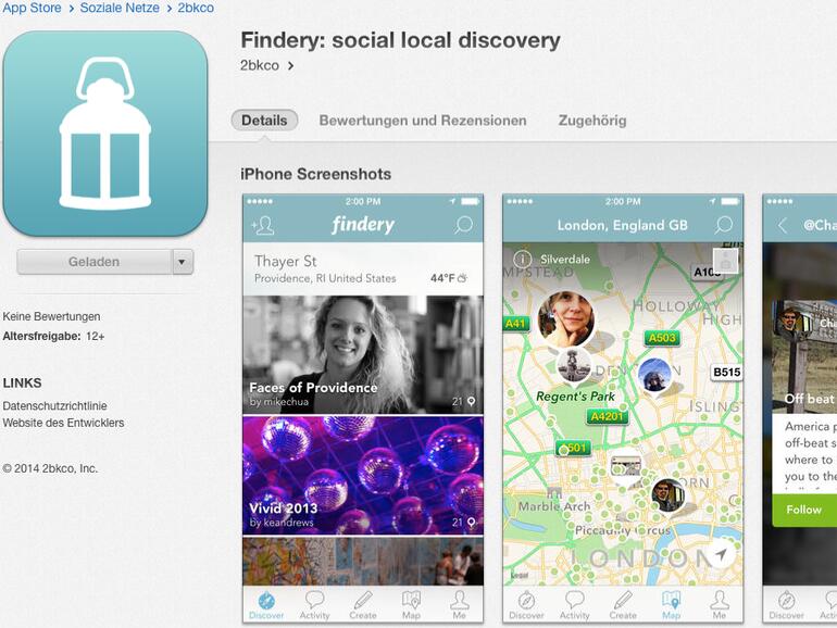 Wer nicht nur entdecken sondern mit anderen interagieren, selbst Landmarken setzen und ein eigenes Profil anlegen möchte, meldet sich gratis als Nutzer mit einem neuen Konto an. Auf Wunsch sendet „Findery“ Push-Mitteilungen, eine FAQ und E-Mail-Support werden auch angeboten. Die App ist mit 19,3 MB Größe kostenlos aus dem App Store zu laden, erfordert iOS 7, läuft auf iPhone, iPad und iPod touch und ist für iPhone 5 optimiert.