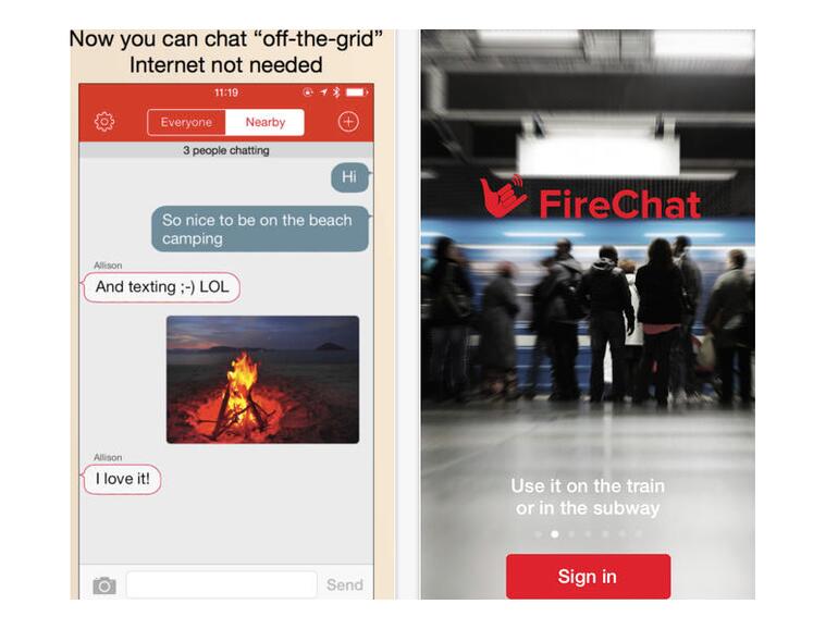 Warum sollte man auch Firechat nutzen, da muss man ja nur noch online sein und via BT mit seinem Nachbarn kommunizieren. Da kann ich auch reden...