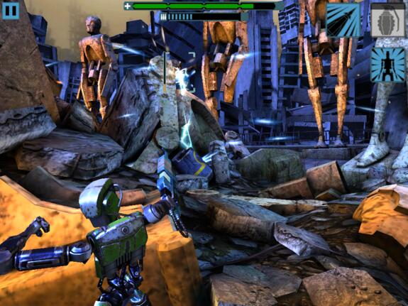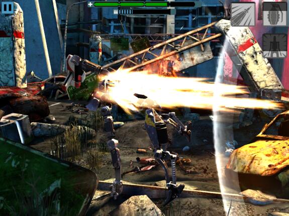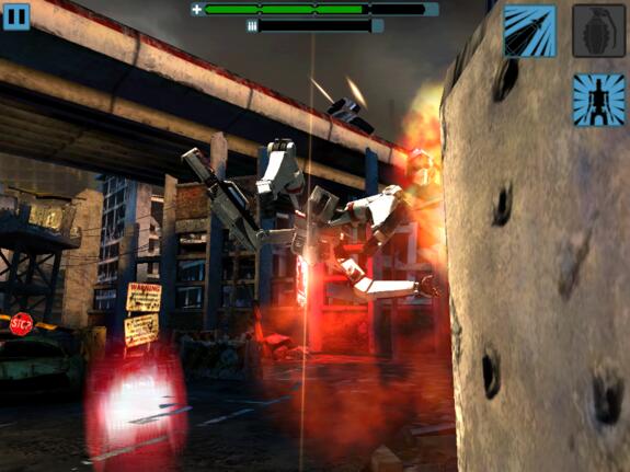 Der Spielstufen bestehen aus Schlachtfeldern, in denen sich die Spielfigur im Vordergrund, Wellen von gegnerischen Robotern im Hintergrund bewegen. Mittels Wischgesten kann die Spielfigur zwischen unterschiedlichen Positionen wechseln und in Deckung gehen. Freies Umherstreifen ist nicht möglich. Gegner werden durch Tippen anvisiert und beschossen, zerbombt oder mit Raketen befeuert, optional kann die Spielfigur zum Laden in Deckung gehen. Die Steuerung spricht gut an und ist innovativ was wichtig ist in den abwechslungsreichen Feuergefechte, bei denen die Gegner mit immer neuen Waffen treiben.