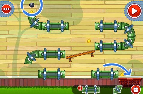 Amazing Alex ähnelt The Incredible Machine (auch im App Store erhältlich), das wiederum das Prinzip der Rube-Goldberg-Maschine aufgreift. In jedem Bild müssen mit den zur Verfügung stehenden Rohren, Tischen und anderen Objekten drei Sterne eingesammelt und vor allem die Aufgabe erfüllt werden - wenn die darin besteht, alle Bälle ins Körbchen zu befördern, nützt es auch nichts, alle Sterne einzusammeln, wenn ein Ball aus dem Korb wieder heraushüpft. Oft gibt es mehrere Wege zum Ziel und der Einsatz aller Objekte ist nicht in jedem Bild erforderlich.