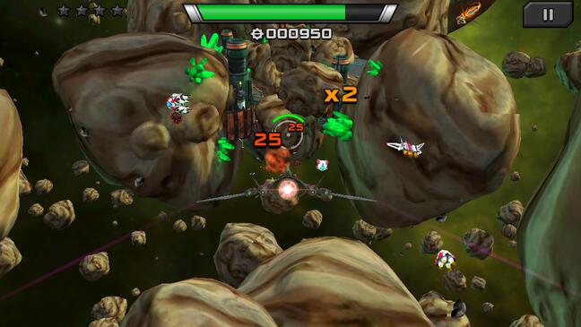 Es bleibt noch genug Bewegungsfreiheit, um feindlichem Feuer auszuweichen. Geschickte Piloten, die Feinde schnell abschießen und alle Würfel einsammeln, bekommen mehr Punkte und erhöhen den Multiplikator. Etwas mehr Geschick erfordern die Boss-Kämpfe, wer hier nicht besteht, sollte die Level davor erneut spielen und das Schiff aufrüsten.
