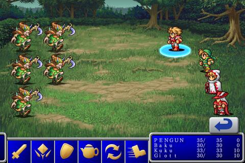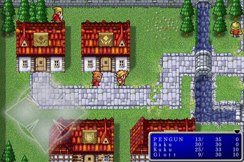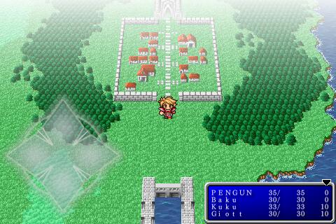 Diese Anpassungen fallen gleich zu Spielbeginn ins Auge, denn gesteuert wird die aus vier Helden bestehende Party mit einem sehr großen Software-Joypad – überflüssig, denn in dem RPG wird nicht in Echtzeit gekämpft. Gegner erscheinen von den Bossen abgesehen zufällig und die erste Zeit ist man damit beschäftigt, ein paar Runden um das Königreich zu joggen, um in Kämpfen die Charakterwerte aufzubessern. Die Grafik ist bunt, aber spärlich animiert, die Musik sehr gut gelungen.