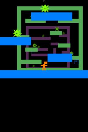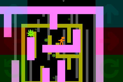 Das betrifft natürlich nicht die Grafik, denn die ist pixelig wie auf dem Mac. Nur auf den ersten Blick ist iJumpman ein simples Hüpfspiel: Die Level lassen sich drehen, die Gegner fallen dann in eine andere Richtung. Dies kann in bestimmten Situationen sehr nützlich sein, etwa, wenn sich die Gegner auf sehr kleinen Plattformen bewegen. Jumpman zu steuern ist auf dem iPhone noch schwieriger als auf dem Mac, unabhängig davon, ob er mit Tasten auf dem Touchscreen oder Gesten bewegt wird. Eine leichte Bewegung mit einem Gegner führt zum Tod, Jumpman besitzt aber unendlich viele Leben.