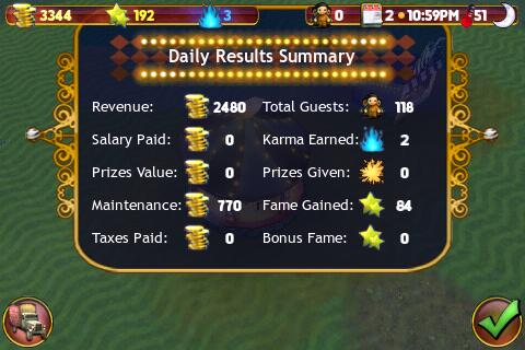 Grafisch ist Karnival für ein Wirtschaftsspiel gut gelungen und es macht Spaß, das Gewusel auf dem Park zu beobachten. Die Zeit lässt sich leider nur wenig beschleunigen, Geduld erfordern auch die Ladezeiten auf einem iPhone 3G. Für unterwegs ist Karnival nichts, eher eignet es sich zum Nebenbeispielen.