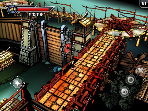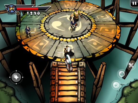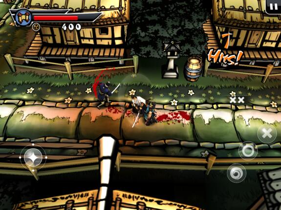 Wobei „Slash’em Up” oder Hack & Slash vermutlich passender wäre, denn natürlich vertraut Samurai Daisuke alleine auf sein Schwert. Statt Wischgesten setzt Madfinger Games nun auf eine konventionelle Steuerung mit virtuellem Stick und drei Feuerknöpfen. Mit zweien davon wird das Schwert geschwungen, eine Kombination aus den beiden Feuertasten führt zu Combos.