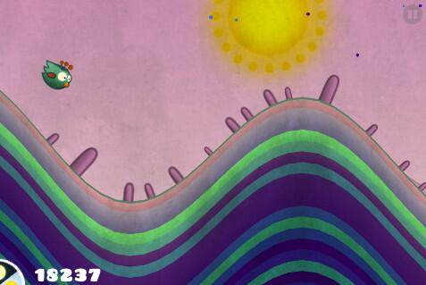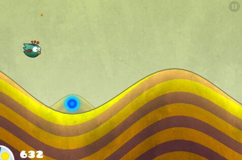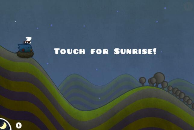 Wobei es sich lohnt, wenn ein Spiel mindestens einen Vogel hat, siehe Angry Birds und Flight Control. Der „Tiny Wings“-Vogel ist aber rein anatomisch schon benachteiligt: Er ist dick, seine Flügel sind klein und an fliegen ist nicht zu denken. Glücklicherweise lebt er in einer hügeligen Landschaft: Rutscht er einen Hügel runter, holt er Schwung und kann dann abheben.