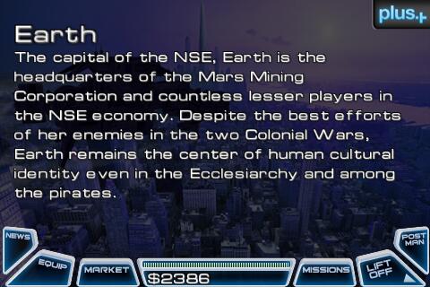 Zu Spielbeginn erhält man ein einfaches Raumschiff mit 10 Tonnen Lagerraum und schwachen Waffensystemen. Die meisten der Planeten besitzen einen Shop, in dem sich Waren ein- und verkaufen lassen. Da die Preise variieren, lässt sich mit Handel Geld verdienen, um die Ausrüstung zu verbessern und bessere Schiffe zu kaufen. Gute Geschäfte lassen sich machen, wenn man sich nicht nur auf ein Planetensystem beschränkt. Asteroiden sind eine weitere Einnahmequelle.