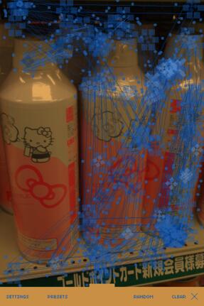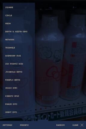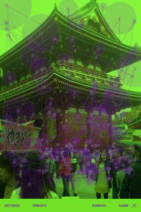 Herausgekommen ist eine Art Malprogramm, bei dem mit Presets gearbeitet wird, die sich während des Zeichnens verändern. Gezeichnet werden abstrakte Muster und Netzwerke, insgesamt gibt es 14 Presets, die sich auch kombinieren, aber nicht unabhängig voneinander auftragen lassen: Wird zuerst mit Kiebitz gezeichnet und dann das Mesh-Preset aktiviert, holt Mesh die mit Kiebitz gezeichneten Striche nach. Multitouch wird unterstützt.