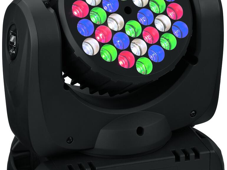 Der kreisrunde Kopf, geführt in einer massiven Gabel, beherbergt 36 Drei-Watt LEDs. Je acht rote und weiße sowie je zehn blaue und grüne stehen für Weißlicht und Farbmischung zur Verfügung. Im Sockel sind Stromanschluss, die Verbindungen für Funksteuerung und eine kabelgebundene Fernbedienung sowie die DMX-Anschlüsse untergebracht. Ein kleines Display an der Frontseite mit vier Tippschaltern zur Menüsteuerung und vier kleine LEDs zur Anzeige des gewählten Betriebsmodus vervollständigen die durchdachte Ausstattung.