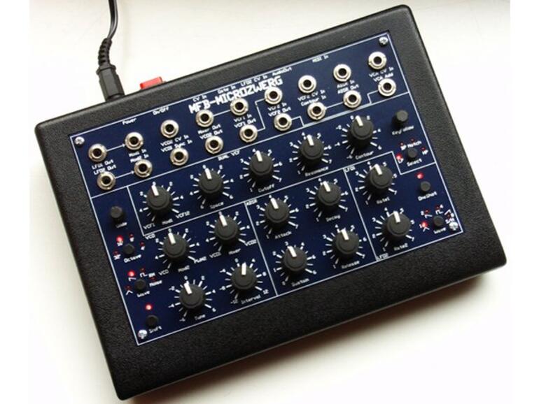 Der Microzwerg kommt im schwarzen, MFB-typischen Industriegehäuse daher. Und wie gewohnt wird die blaue Frontplatte von zahlreichen Tastern, Drehpotis, LEDs und insgesamt 18 Patchbuchsen dominiert. Während die Bedienelemente der Bearbeitung am Gerät selbst dienen, erlauben die Patchanschlüsse Verbindungen zu anderem (semi-)modularen Equipment. Im Detail können analoge Steuerspannungen und Audiosignale an verschiedenen Stellen im Signalweg abgegriffen und eingeführt werden. Weitere Anschlüsse für CV- und MIDI-Signale sowie für die Stromversorgung finden sich neben einem Netzschalter auf der Rückseite des Gerätes. Die Verarbeitung ist ausgezeichnet, lediglich die Bedienung der beiden Minipotis für Glide und Keyfollow machten den kräftigen Fingern des Testers Probleme.
