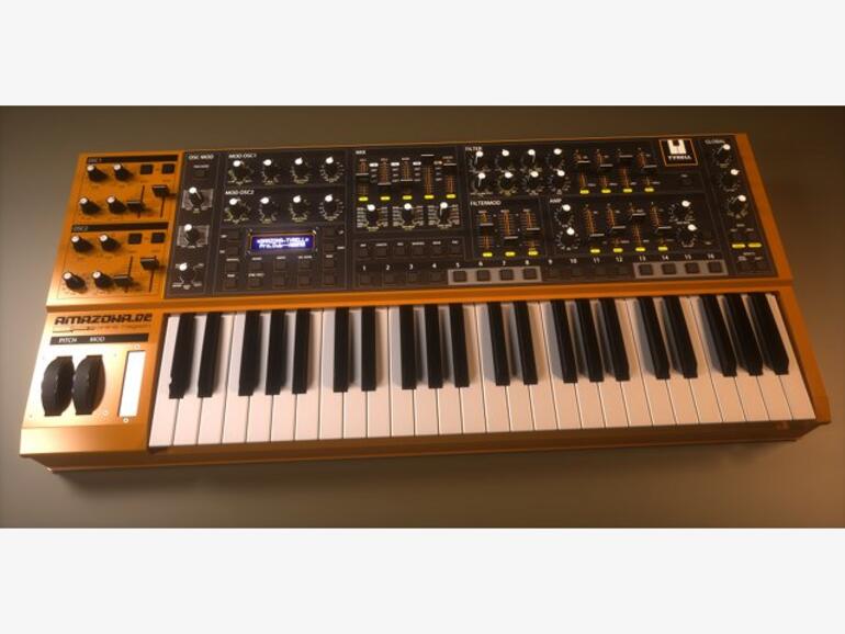 Kaum war die Auswertung veröffentlicht, klopfte Uli wieder an die Tür und präsentierte uns die Kopie eines vollständigen Roland Juno-60 mit MIDI für einen geplanten Verkaufspreis von 500 Euro. Er hatte Feuer gefangen und sein Team hat das Ding zerlegt und zu kalkulieren begonnen. Das Problem war nur, dass er dem Markt nicht die gewünschten Stückzahlen zutraute. Und so zog er sich wieder zurück. Ich hingegen hatte nun erst recht Lust bekommen, weiter zu machen. In der nächsten Amazona-Umfragerunde erweiterten wir das Thema: „Wie würdest du einen Juno-60 ergänzen, damit daraus dein Traum-Synth werden würde?“ Aus einer ewig langen Liste an Features konnte man aber nur fünf Ausstattungsmerkmale auswählen. Aus dieser Leser-Expertise und dem Grundaufbau eines Juno-60 entwickelte Mic Irmer dann den Tyrell. Ich kümmerte mich um das Layout, den Namen und engagierte Stephan Gries, um das Ganze in 3D umzusetzen. Und da steht er nun. Zumindest virtuell.