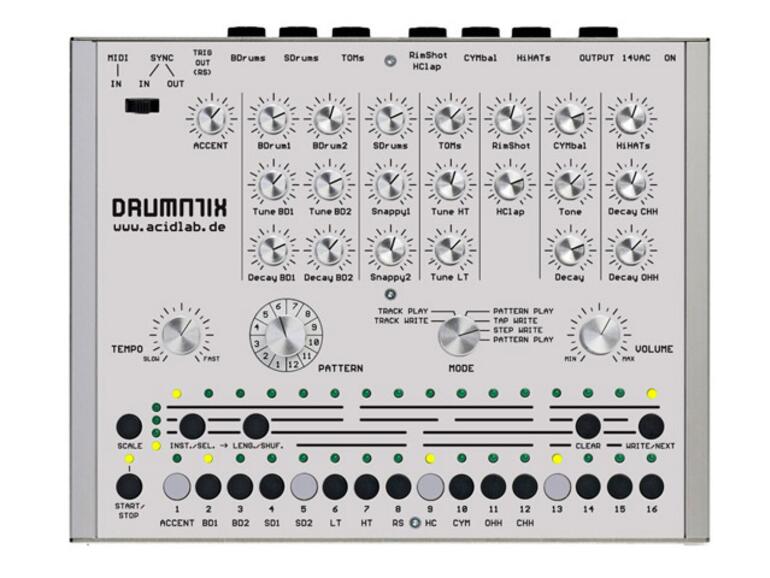 Ergänzend gibt es eine Bassdrum, Snare und einen Rimshot von der TR-808 sowie einen Handclap-Sound ähnlich des Boss DR-110 zu entdecken. Beim Gehäuse setzt Acidlab wie gewohnt auf Aluminium. Neben einem Summenweg sind insgesamt sechs Einzelausgänge vorhanden. Der Sequenzer kommt mit dem gleichen Funktionsumfang wie beim Miami daher.