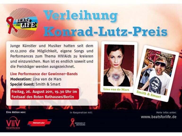 Die Preisverleihung findet am Freitag den 26. August im Rahmen des Get-togethers von „HIV im Dialog“ statt. Ort des Geschehens ist der Festsaal im Roten Rathaus in Berlin um 19:30 Uhr. Der Gewinner erhält dabei den mit 3.000 Euro dotierten Konrad-Lutz-Preis. Neben der Gewinnerband, die ihren Song live performen wird, legt zudem das Berliner DJ Duo Smith & Smart auf. Die Moderation übernimmt an diesem Abend Lina van de Mars, Jurymitglied der Aktion „Beats for Life“. Die drei Nominierten Chaoze One, WHO DAT und Bastian ft. Anna können bereits vorgehört werden.