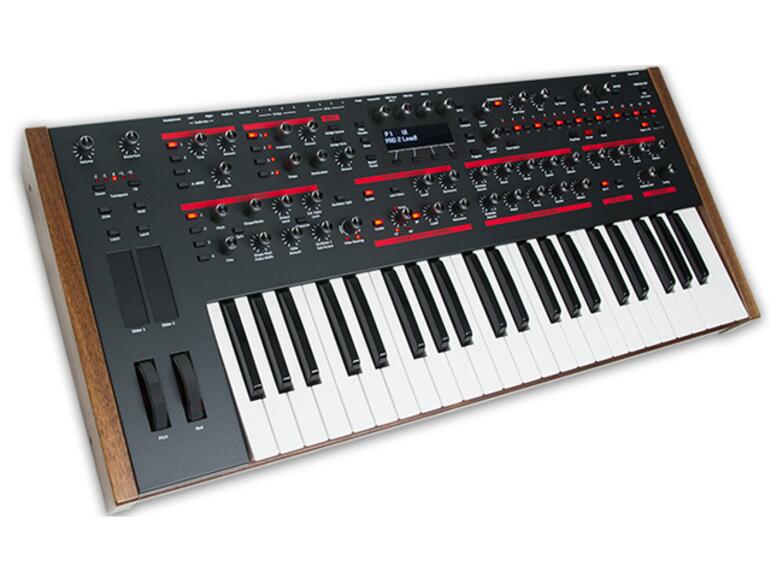 Ein CV Gate ist ebenfalls vorhanden. Vier LFOs, Multi-Tap-Delay, ein Arpeggiator und die aus dem Prophet bekannten Effekte Drive, Hack, Decimation, Girth und Air, sowie die beiden Ribbon Controller runden das dicke Paket ab.