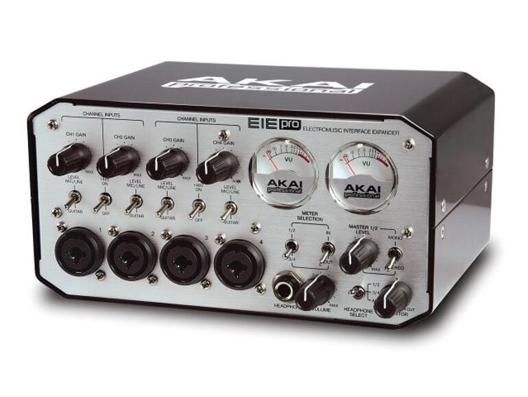 Jeder Kanal des EIE Pro besitzt XLR/Klinke-Combo-Eingänge, stabile Gain-Regler sowie Mic/Line/Guitar-Umschalter. Die Mikrofoneingänge bieten laut AKAI diskret aufgebaute Vorverstärker und aktivierbare 48-Volt-Phantomspannung für den Einsatz von Kondensatormikrofonen. Über vier 6,3-mm-Inserts auf der Rückseite lassen sich externe Effekte oder Dynamikprozessoren einschleifen. Ein 5-Pol-MIDI-Interface, Kopfhörerausgang sowie hochwertige AD/DA-Wandler sind vorhanden.