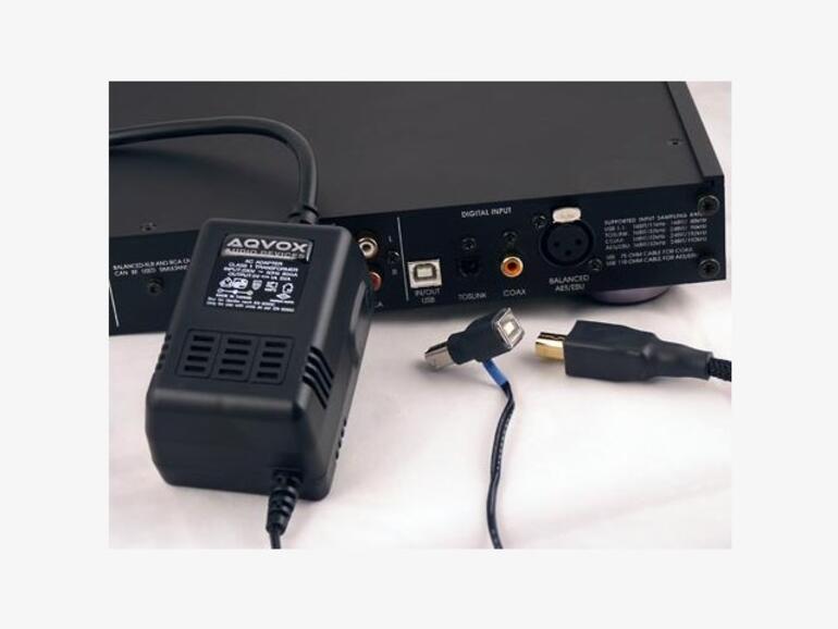Das AQVOX USB-Low-Noise-Transformator-Netzteil hat laut Hersteller nur ca. 1 mVolt Störspannungen. Es verfügt über einen einzigartigen USB-Adapter, dessen eine Seite in die USB-Buchse des DA-Wandlers kommt und dessen Rückseite das USB-Kabel aufnimmt. In diesem Adapter werden vom USB-Kabel nur die beiden USB-Datenleitungen durchgereicht. Die USB-Stromversorgung vom Computer wird jedoch unterbrochen und durch die Stromversorgung des AQVOX USB-Low-Noise-Netzteils ersetzt. Durch die saubere Stromversorgung und die unterbrochenen Stromleitungen soll die klangliche Performance erheblich gesteigert werden.