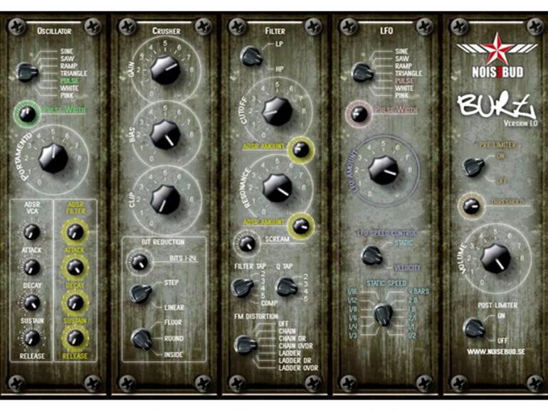 Der Fokus des Waveshaping-Synthesizers Burt liegt laut Noisebud auf dreckige Bass-Sounds, die ohne aufwändiges Sounddesign im Handumdrehen erzeugt werden können. Zum Anschmutzen des Signals stehen verschiedene Features wie Bit-Reducer, Crusher, Scream und FM-Distortion bereit. Weiter verfügt Burt über sieben Wellenformen, zwei ADSR-Hüllkurven, einen Tief/Hochpass-Filter sowie einen LFO mit ebenfalls sieben Wellenformen. Um den schreienden Synthesizer im Zaum zu halten, wurden ein Pre- und Post-Limiter hinzugefügt.