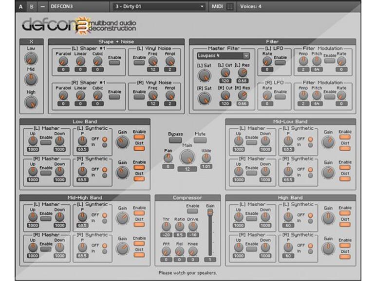 Neben Hoch-, Tief- und Bandpass-Filtern, bietet das Plug-In dem Audiotüftler noch einen LFO-Destruction-Modulator, Filter-Sättigung, Vinyl-Kratzen sowie einen Cubic/Linear/Parabolic-Shaper. Weiter verfügt Defcon 3 über Master-Pan, Stereoverbreiterung sowie einen Kompressor, der schlechteste Dienste im Sinne kreativer Ästhetik leisten soll.