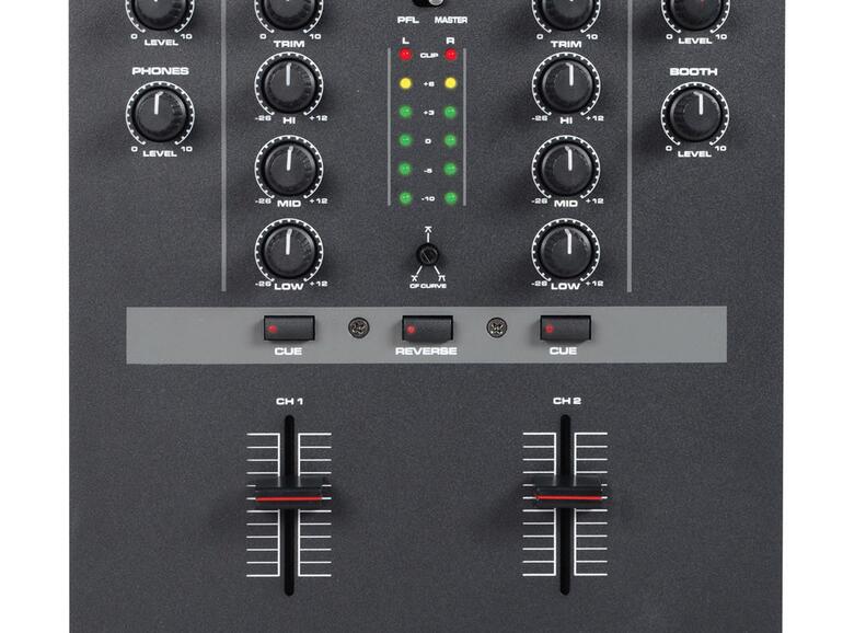Als Cross- und Line-Fader verwendet das Unternehmen DJ-Tech die relativ jungen Mini-Innofader der Marke Audio Innovate, die sich durch eine extrem lange Lebensdauer auszeichnen sollen. Eine Dreiband-Equalizer-Sektion pro Kanal, ein Mikrofonausgang in 6,3-mm-Klinke inklusive Lautstärkeregler sowie zwei Kopfhörer-Ausgänge (3,5 und 6,3 mm) sind ebenfalls mit dabei. Master- und Booth-Ausgänge dürfen natürlich auch nicht fehlen.