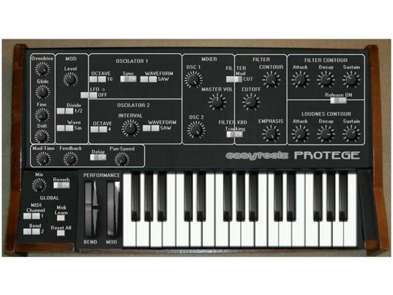 Der VST-Synthesizer Easy-Protege 1.5 arbeitet mit zwei Oszillatoren und verfügt pro Oszillator über die Wellenformen Sägezahn, Dreieck und Rechteck. Beide können über mehrere Oktaven grob gestimmt werden. Der zweite Oszillator kann zusätzlich über den Regler Finetuning stufenlos über eine Oktave getuned werden. In der Mixersektion werden beide Signale gemischt. Ein „spezieller“ Tiefpass-Filter mit Cutoff, Emphasis und ADS-Hüllkurve steht bereit. Weiter verfügt der Synthesizer über zwei ADS-Hüllkurven mit Releas-Button für Filter 1 und den VCA-Amplifier.