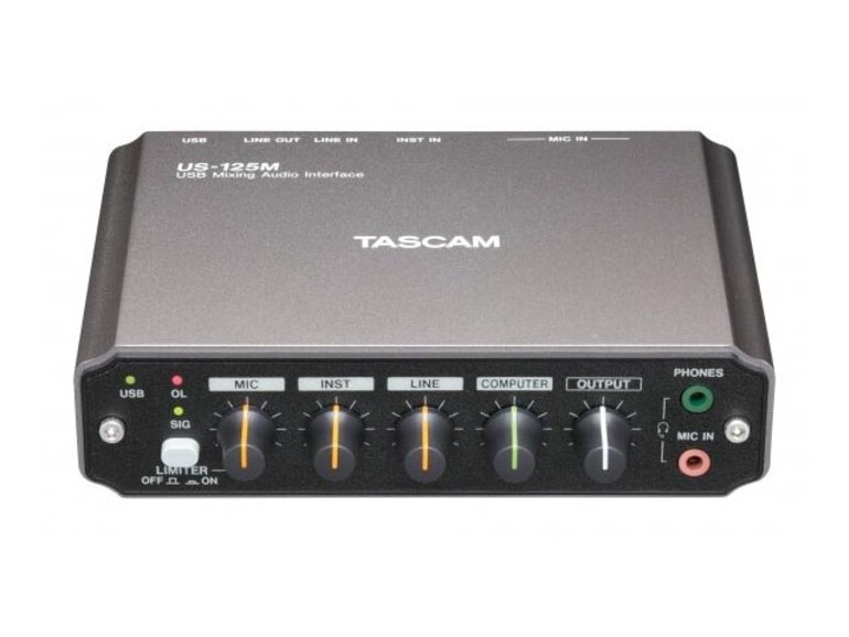 Das Tascam US-125M ist mit vier Eingängen ausgestattet, die sich alle samt einzeln regeln lassen, und somit als Mixer fungieren. Der Mikrofon-Eingang bietet einen XLR-Anschluss auf der Rückseite, einen 3,5-mm-Klinke-Anschluss auf der Vorderseite und ist zusätzlich noch mit einem Limiter ausgestattet, um Übersteuerungen zu vermeiden. Neben diesem Eingang findet der Nutzer noch einen Instrumenten-Eingang (6,3-mm-Klinke), einen Stereo-Cinch-Line-Eingang sowie einen Stereo-Audioinput vom Computer via USB.