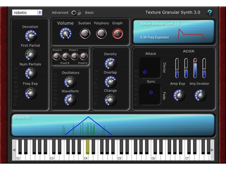 Texture Granular Synth 3.0 erzeugt eine Grain-Abfolge, in der jedes Grain von den Parametern Density, Overlapping, Sychronism und Fade abhängig ist. In der Basic-Ansicht können vier Presets ausgewählt und zwischen diesen übergeblendet werden, sodass ein neuer Sound entsteht. Das Spektrum der erzeugten Klänge kann laut Hersteller harmonisch erweitert oder verringert werden.