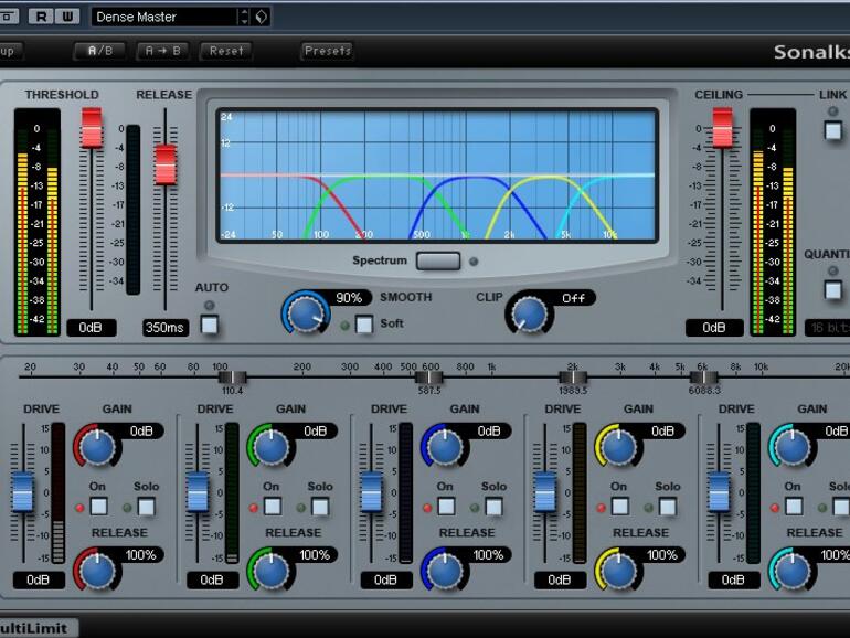Mit MultiLimit liegt auch eine fünfbandige Version des Limiters mit regelbaren Crossover-Frequenzen und einer Solo-Funktion für jedes Band vor. Dreht man den Drive-Regler eines Bands auf, arbeitet dieses schmalbandiger und beeinflusst die Limitierung der anderen Bänder weniger. Das Display gibt Auskunft über die Trennfrequenzen sowie die jeweiligen Verstärkungen und integriert ein nützliches Spektrum-Analysewerkzeug.