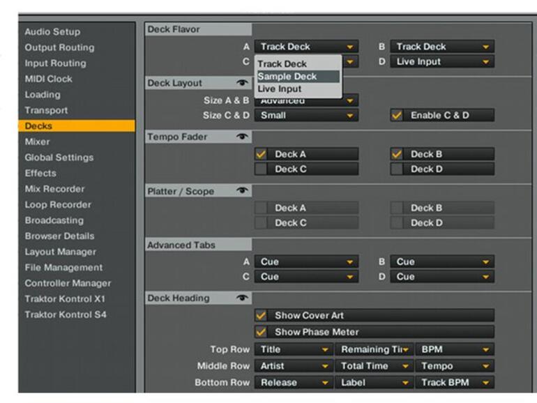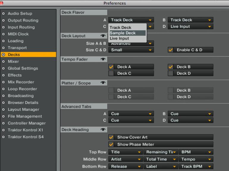 Traktor Pro S4 bietet verschiedene Deckarten und Kombinationsmöglichkeiten. Wählen Sie für diesen Workshop ein Setup aus zwei Track-Decks und zwei Sample-Decks. Öffnen Sie dazu das Preferences-Fenster und wählen Sie den Menüpunkt Decks. Aktivieren Sie die Decks C&D im Deck-Layout und wählen Sie für diese beiden Decks die Deckart Sample Deck im Menü Deck Flavor.