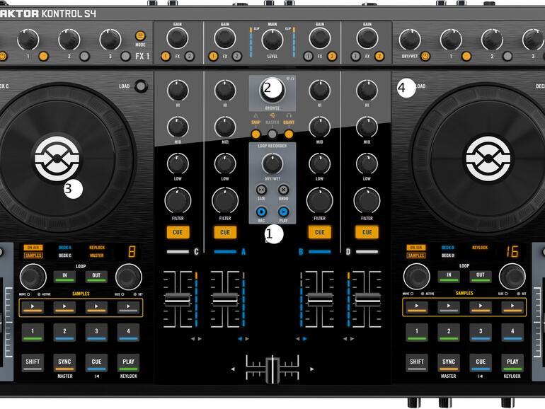 Das Traktor-Kontrol-S4-System wurde so konzipiert, dass die meisten Funktionen ohne Mauseinsatz gesteuert werden können. Drücken Sie zum Aufrufen der Browser-Darstellung den Browse-Knopf auf dem Controller 1. Blättern Sie mit dem Browse-Encoder 2 oder einem der Jog-Räder 3 durch die Songbibliothek. Durch Drücken des Load-Buttons 4 wird der Song in das entsprechende Deck geladen.