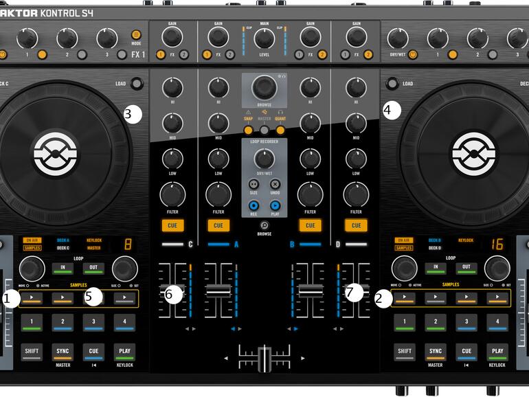 Die Oberfläche des Traktor Kontrol S4 ist so gestaltet, dass die Sample-Decks C 1 und D 2 auch dann bedient werden können, wenn der Steuerungsfokus der Hardware auf den Track-Decks A 3 und B 4 liegt. Starten Sie ein Sample, indem Sie die entsprechende Taste 5 auf dem Controller drücken, und schieben Sie den Kanalfader 6 nach oben.