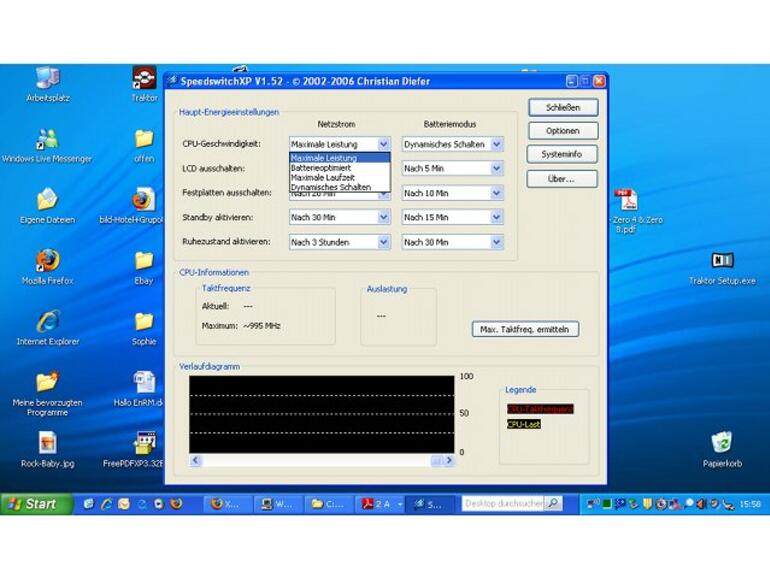 Energiesparen ist in vielen Fällen eine schöne und sinnvolle Angelegenheit. Wenn Sie allerdings eine Echtzeitaudioanwendung auf einem Computer ausführen möchten, kann es dabei zu Störungen kommen. Mit der kostenlosen Applikation Speedswitch XP können Sie das automatische Heruntertakten Ihrer Netbook-CPU verhindern, indem Sie nach dem Programmstart die Einstellung Maximale Leistung selektieren. Der Hardware schaden Sie damit nicht.