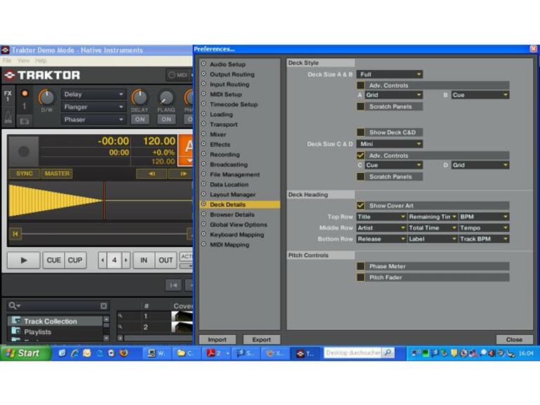 In den Preferences von Traktor haben Sie die Möglichkeit, nicht zwingend benötigte Programmeinblendungen zu deaktivieren. Wenn Sie beispielsweise mit der automatischen Synchronisationsfunktion arbeiten und keine Timecode-Schallplatten oder -CDs einsetzen, können Sie bedenkenlos auf die Anzeige des Phase Meter und des Pitchfader verzichten. Gerade letzterer hat einen relativ hohen Platzbedarf und kann im Menüpunkt Deck Details unter Pitch Controls ein- und ausgeblendet werden.